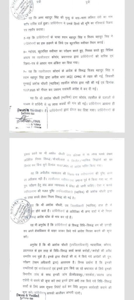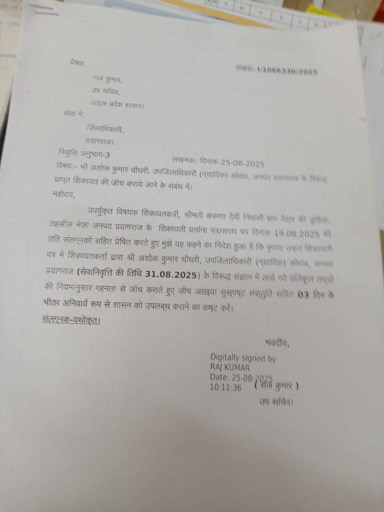 प्रयागराज: नियुक्ति विभाग में प्रयागराज के कोराव के उप जिलाधिकारी (न्यायिक) अशोक कुमार चौधरी के खिलाफ प्राप्त शिकायतों की जांच के आदेश डीएम,प्रयागराज को दिए हैं उप सचिव राजकुमार की ओर से जारी आदेश में कहा गया है कि चौधरी के खिलाफ मेजा निवासी करुणा देवी ने शपथ पत्र देकर शिकायत की है की भारी भरकम राशि लेकर क्षेत्राधिकार की विपरीत आदेश किया गया है।शिकायतकर्ती महिला ने अपने शपथ पत्र में कहा है कि एसडीएम के द्वारा 15 लाख रुपए की दलालों के माध्यम से मांग की गई ना दिए जाने पर एसडीएम ने विपक्षी से 15 लाख रुपए लेकर उसके पक्ष में नियम के विरुद्ध जाकर आदेश कर दिया। विधिविरुद्ध कार्य करके अशोक कुमार चौधरी ने करोङो की अवैध संपति अर्जित की है।इस प्रार्थना पत्र पर गंभीर आरोप की जांच 3 दिन के भीतर उपलब्ध कराने के लिए डीएम,प्रयागराज से कहा गया है। नियुक्ति विभाग की ओर से जारी इस पत्र में यह भी लिखा गया है कि अशोक कुमार चौधरी 31 अगस्त की सेवानिवृत हो रहे हैं।