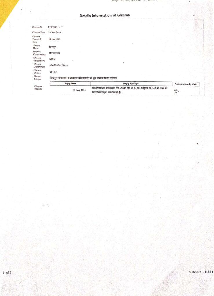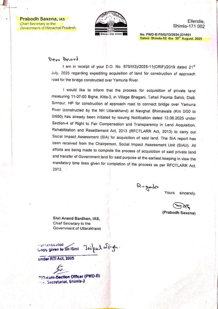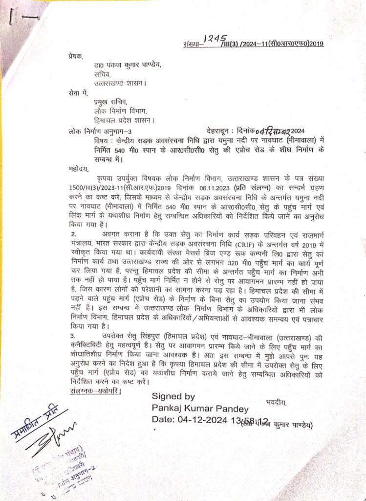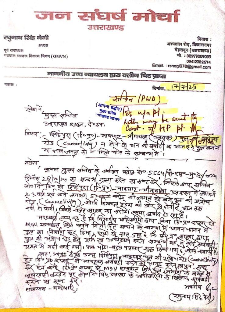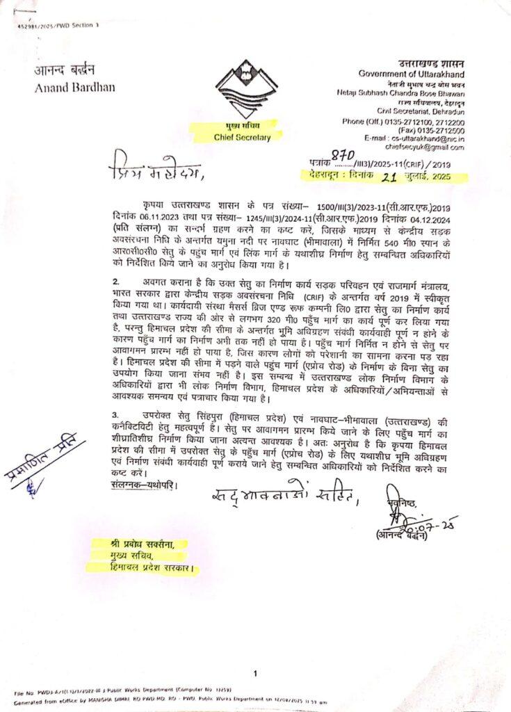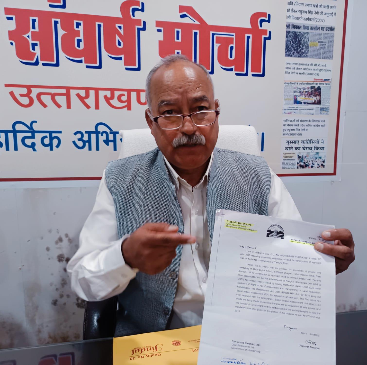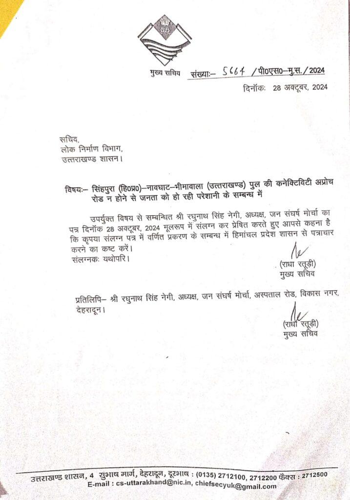 विकासनगर -जन संघर्ष मोर्चा अध्यक्ष एवं जीएमवीएन के पूर्व उपाध्यक्ष रघुनाथ सिंह नेगी ने बताया कि सिंहपुरा (हि.प्र.)- नावघाट, भीमावला (उत्तराखंड) पुल,जोकि लगभग 2 साल से बनकर तैयार है, के मामले में सिर्फ और सिर्फ जन संघर्ष मोर्चा ही इसकी कनेक्टिविटी मामले में प्रयासरत है |अगर अन्य जनप्रतिनिधियों की बात करें तो सभी सिर्फ और सिर्फ गाल बजाई व श्रेय लेने की होड तक सीमित हैं | पुल कनेक्टिविटी मामले में मोर्चा द्वारा 28/10/ 2024 को मुख्य सचिव से आग्रह किया, जिसके क्रम में लोक निर्माण विभाग, उत्तराखंड शासन द्वारा दिनांक 4/12/24 को हिमाचल प्रदेश, लोक निर्माण विभाग को पत्र प्रेषित कर कार्रवाई का अनुरोध किया | तत्पश्चात मोर्चा द्वारा फिर से मुख्य सचिव श्री आनंद बर्धन से दिनांक 17/7/25 को उक्त मामले में जल्द कार्रवाई की मांग की, जिसके क्रम में मुख्य सचिव श्री आनंद बर्धन द्वारा हिमाचल प्रदेश के मुख्य सचिव श्री प्रबोध सक्सेना से वार्ता की गई एवं उनको दिनांक 21/7/25 के द्वारा स्वयं पत्र प्रेषित किया गया, जिसके क्रम में मुख्य सचिव,हिमाचल प्रदेश श्री प्रबोध सक्सेना द्वारा दिनांक 30/8/25 के द्वारा मुख्य सचिव उत्तराखंड को अवगत कराया गया कि उक्त मामले में एसआईए (सोशल इंपैक्ट एसेसमेंट) रिपोर्ट को स्वीकृति मिल चुकी है तथा जल्द ही प्राइवेट लैंड सरकार को ट्रांसफर हो जाएगी | वैसे इस पुल को शासनादेश संख्या 2501/ 2015 दिनांक 18/ 4/15 के द्वारा 1.42 करोड़ स्वीकृत किया गया था | मोर्चा ने जन प्रतिनिधियों को आगाह किया कि जनता को बरगलाना बंद कर धरातल पर कार्य करें | मोर्चा की महिम धरातल पर होती है,जिसके साक्ष्य भी प्रस्तुत किए जाते हैं |
