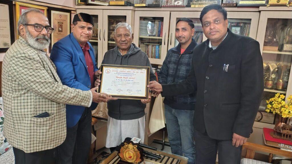 उत्तराखंड (देहरादून) रविवार, 18 जनवरी 2026 आज उत्तराखंड सामाजिक समाज सेवा ट्रस्ट ने गढ़वाली लोक गायक श्री नरेंद्र सिंह नेगी जी का उनके निवास स्थान पर जाकर देवभूमि विभूति सम्मान से सम्मानित किया। उत्तराखंड सामाजिक समाज सेवा ट्रस्ट में नरेंद्र सिंह नेगी जी को उत्तराखंड सामाजिक सामान सेवा ट्रस्ट का सम्मान पत्र व स्मृति चिन्ह भेंट किया।श्री नरेंद्र सिंह नेगी जी ने गढ़वाली संगीत,संस्कृति व परंपरा को उत्तराखंड में ही नहीं अपितु देश विदेश में फैलाया है। श्री नरेंद्र सिंह नेगी जी ने युवाओं को संदेश देते हुए कहा कि हमें अपनी बोली भाषा,संस्कृति, रीति रिवाज और परंपराओं का भूलना नहीं चाहिए इन से जुड़े रहना चाहिए जिससे हमारे समाज की एक विशिष्ट पहचान बनी रहे।सम्मान कार्यक्रम में अध्यक्ष राजू वर्मा, महासचिव राकेश शर्मा, उपाध्यक्ष राकेश कुमार भट्ट, कोषाध्यक्ष रूद्र पाल सिंह व मंगल आदि अन्य सदस्य उपस्थित रहे।